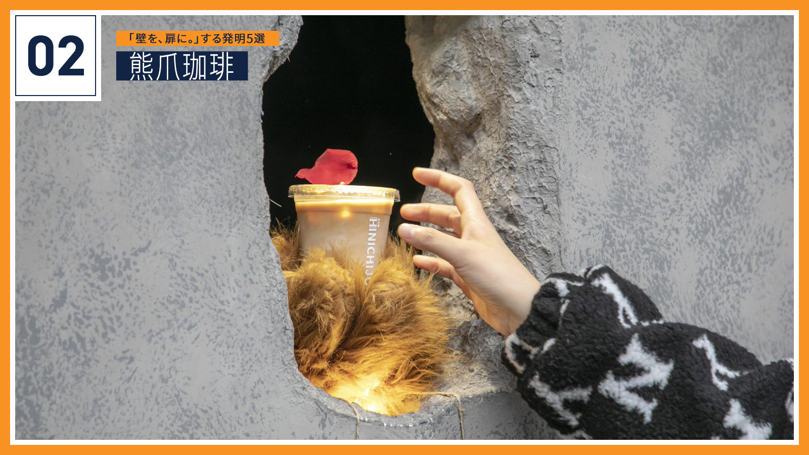 2つ目に選んだ「HINICHIJOU」は、中国の上海にある小さなカフェ。中国では「熊爪珈琲」(シオンヂュアコーヒー)の相性で親しまれています。カフェと言っても入り口や座席はなく、壁にひとつ穴があいているだけ。注文した客は外で待ち、出来上がるとこの穴からモフモフの熊の手が珈琲などのドリンクを手渡してくれます。コーヒーはバリスタの育成に注力した本格的なもの。さまざまな理由で外で働くのをためらっていた人を積極的に雇用しています。向こう側にいる熊の様子を想像するだけで楽しいこのカフェは、接客などの「人の目が気になる場で働けない」という心の「壁」を、熊というモチーフを介して楽しくなくしてしまう発明です。海外展開が待ち遠しい!