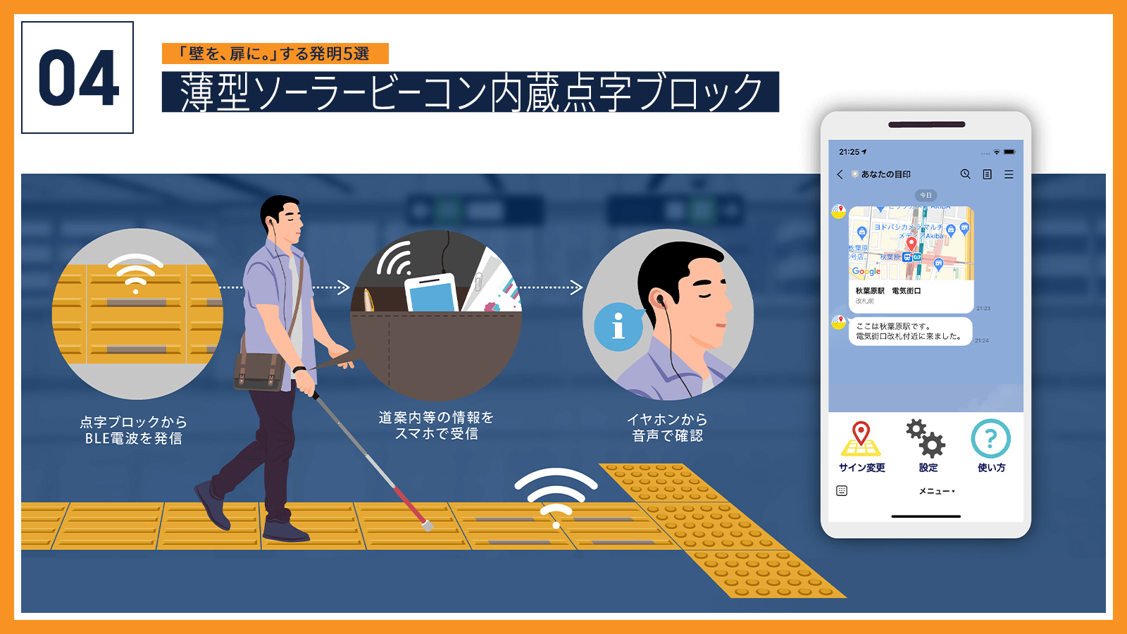 4つ目は、僕も開発に関わっている「薄型ソーラービーコン内蔵点字ブロック」です。1965年に日本で発明され、世界75ヵ国で使われている点字ブロックをテクノロジーでアップデート。視覚障がいのある方が「薄型ソーラービーコン内蔵点字ブロック」に近づくと、LINEアプリにプッシュ通知が届き、位置情報やルートガイドなどを知らせることができるというものです。ワイヤレスイヤホンを使用すれば、スマホをしまったままでも音声で案内情報を得ることができます。視覚障がいのある方はひとりでの遠出が難しいという「壁」を、形はそのままにテクノロジーの力でアップデートした発明です。