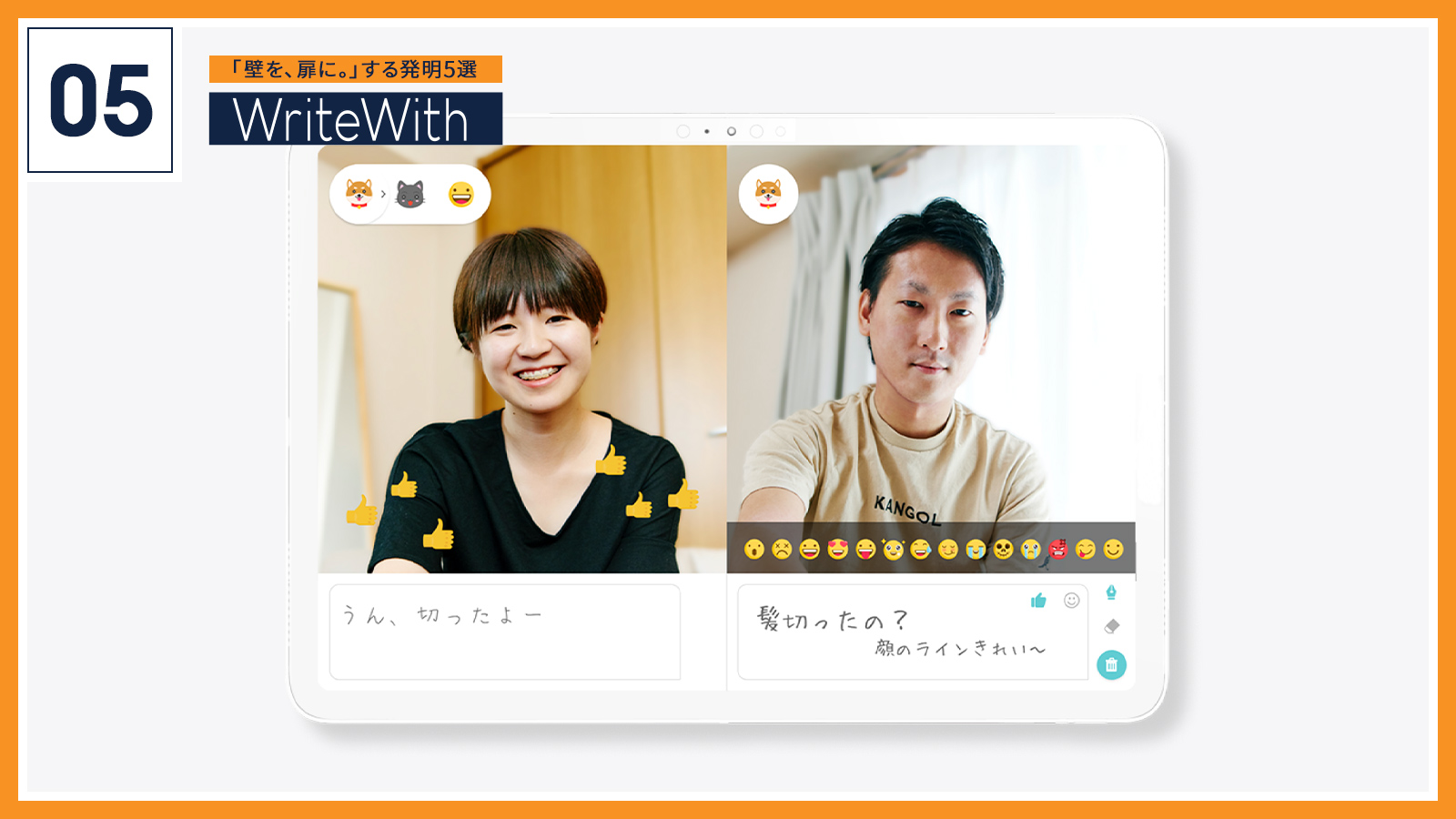 聴覚障がいのある方は筆談でコミュニケーションを取る場面が多いです。5つ目の「WriteWith」はMicrosoft社と一般社団法人PLAYERSで共同開発した筆談コミュニケーションアプリ。「面白いことを書く時はつい笑顔になる」という観察結果をヒントに、筆談中の文字と相手の顔がひとつの画面で見られるレイアウトにしました。カメラに映った表情を認識し感情に対応したアイコンを表示する感情認識機能や、書いた文字を画像解析し関連する絵文字を提示する機能など、筆談をより楽しめる仕掛けがたっぷり。お互いの顔がよく見えるので、手話や読唇も併用できます。聴覚障がいのある人とのコミュニケーションという「壁」も、こんな楽しいアプリがあればそれを壊すきっかけになるかもしれません。僕は相手の顔に落書きできる隠し機能がお気に入り。