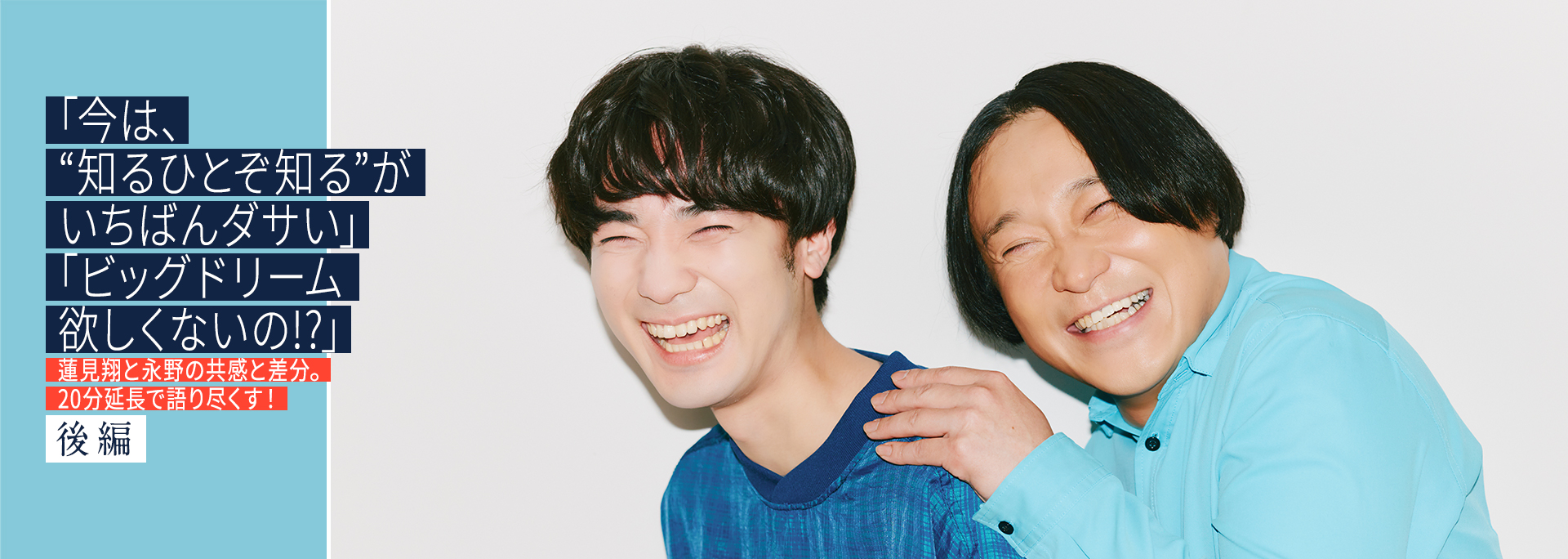 永野 いまのダウ90000って、センスと実力があって、ちゃんとカルチャー好きなひとたちの心を掴んでると思うんだけど、お茶の間に広く知られているわけではないですよね。そこでいま聞きたいのは、蓮見くんには「有名になりたい!」っていう欲があるのか? ということで。