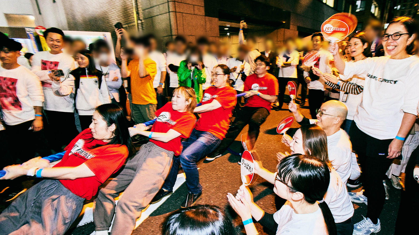 なんと、全く綱が動きません! 両者が一歩も譲らないまま、ついにカウントダウンが始まりました。それでも綱は中心から動かず、ギャラリーの盛り上がりも最高潮に。あともう少し。ここで引きずられまいと必死に綱を引っ張ります。ついにカウントがゼロになり、判定は……「青山メイン企画プルズ」さんの勝利。最後の1秒、わずか数センチの勝負でした。惜しくも敗れてしまいましたが、メンバーたちは晴れ晴れとした顔。本気で取り組む綱引きのたのしさを噛みしめました。