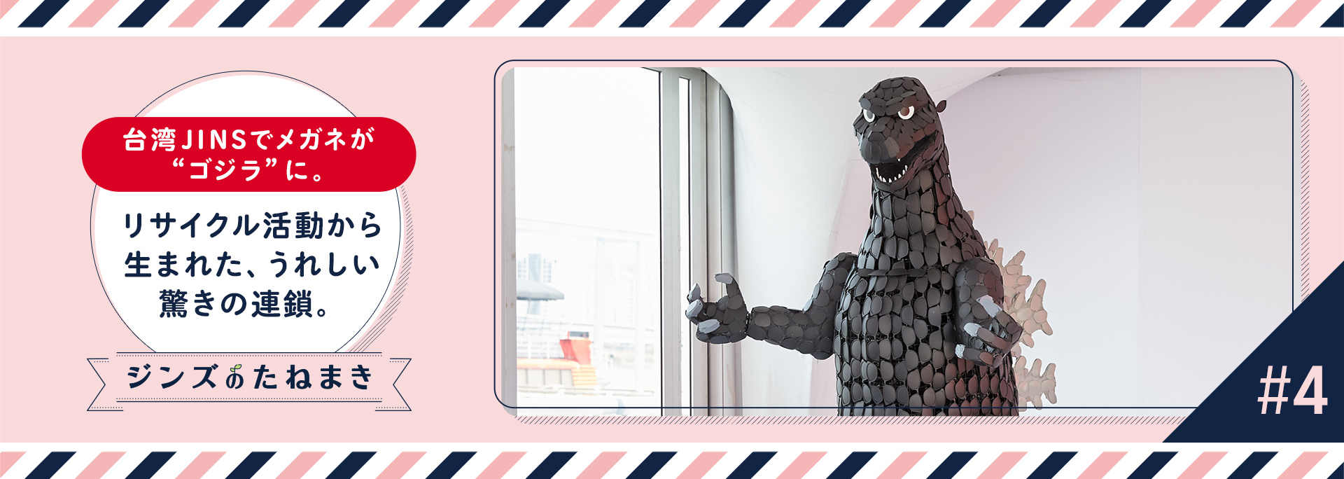 レンズやフレームを巧みに使い、作り上げられたボディは高さ2メートル。よく見ると、レンズひとつひとつがずらりと並び、ゴジラ色に塗装されていることがわかります。李さんも「メガネを材料にしたアートははじめて」と大きな熱意を傾けてくれ、その出来栄えにまたも驚かされることになったのでした。