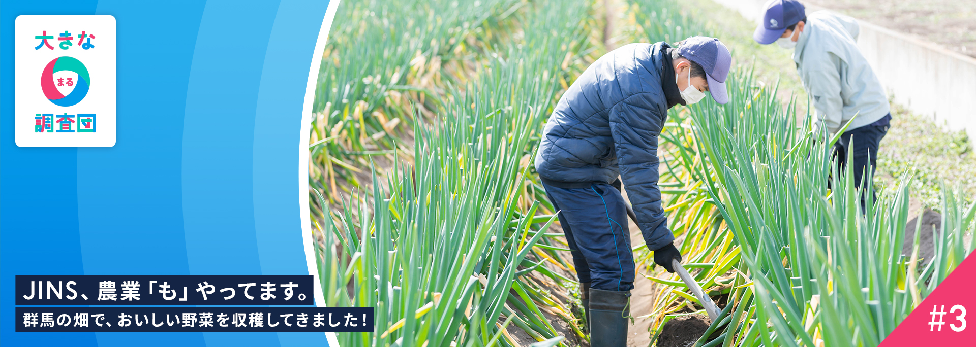 2月某日、時刻は10時30分。“大きな〇調査団”は群馬県高崎市にある畑にいた。目の前には整然と植えられたネギ。雲ひとつない快晴で太陽は燦々と地上に降り注ぎ、青々と伸びたネギの葉を照らしている。取材した日はひんやりしていてまだ肌寒かったが、澄んだ空気を吸い込むと気持ちがいい。これから私たち大きな〇調査団は、JINS normaという農業に取り組んでいる事業に密着取材をする。